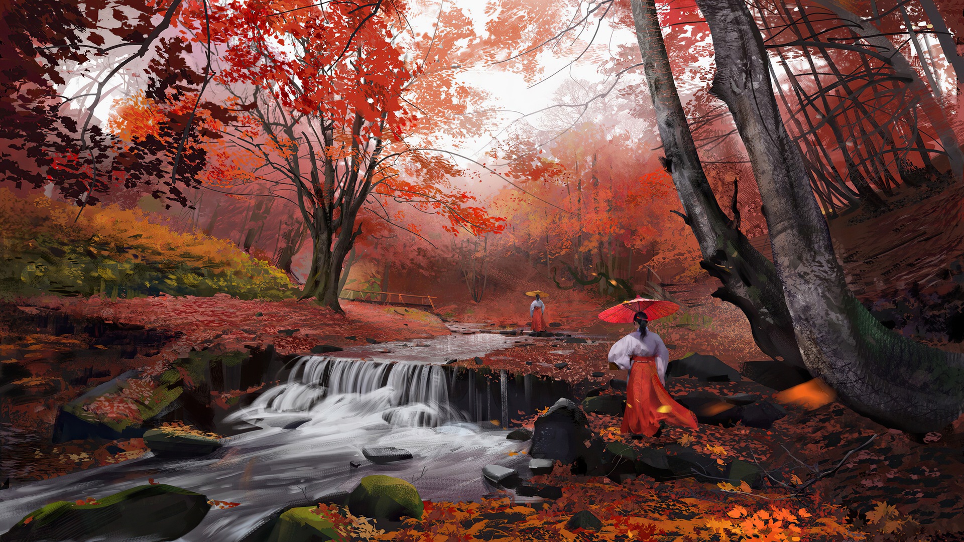 Древние Азиатские Девушки Утренняя Прогулка Осенью 4k
